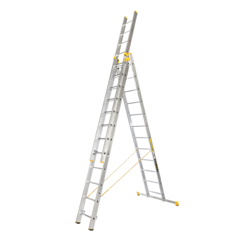Háromrészes egyszemélyes létra, ami azt jelenti, hogy a második rész összecsukott és kibontott állapotban kicsúszhat az első részből.A harmadik résznek köszönhetően gyakorlatilag megdönthetjük a létrát, ha elengedjük a létra részei közötti hevedert, így nagyobb stabilitást kapunk.