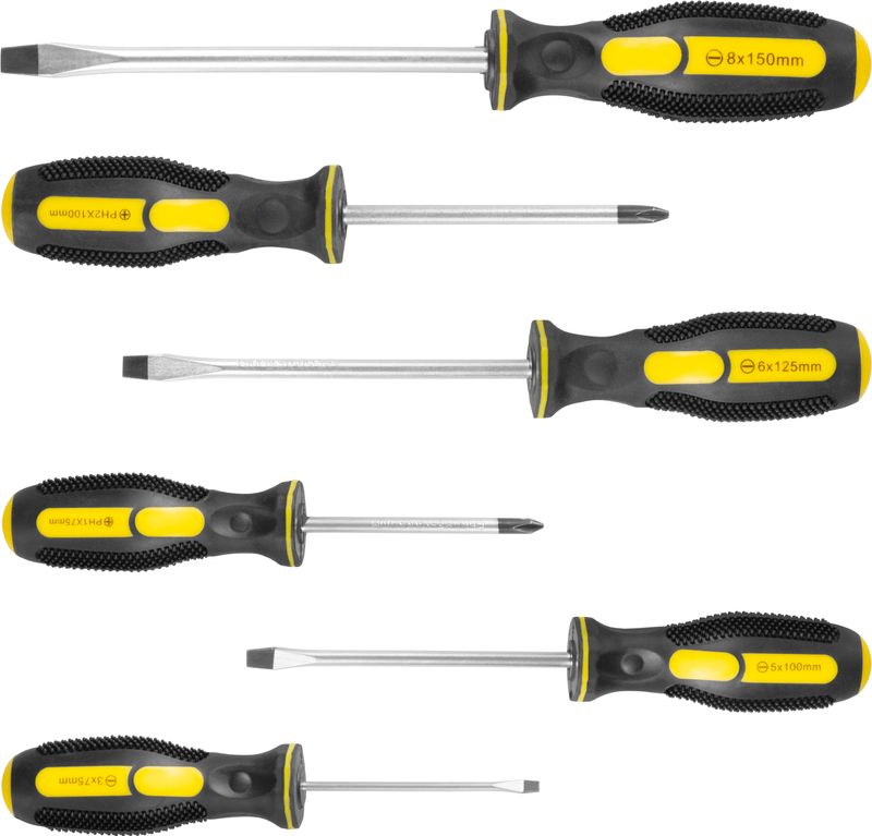 A Strend Pro csavarhúzókészlet nem hiányozhat muhelyébol. A készlet 6 csavarhúzóból áll (lapos és kereszt). A csavarhúzók krómvanádiumból készültek és mágnessel rendelkeznek. PL 3 x 75, 5 x 100, 8 x 150 PH 1 x 75, 2 x 100