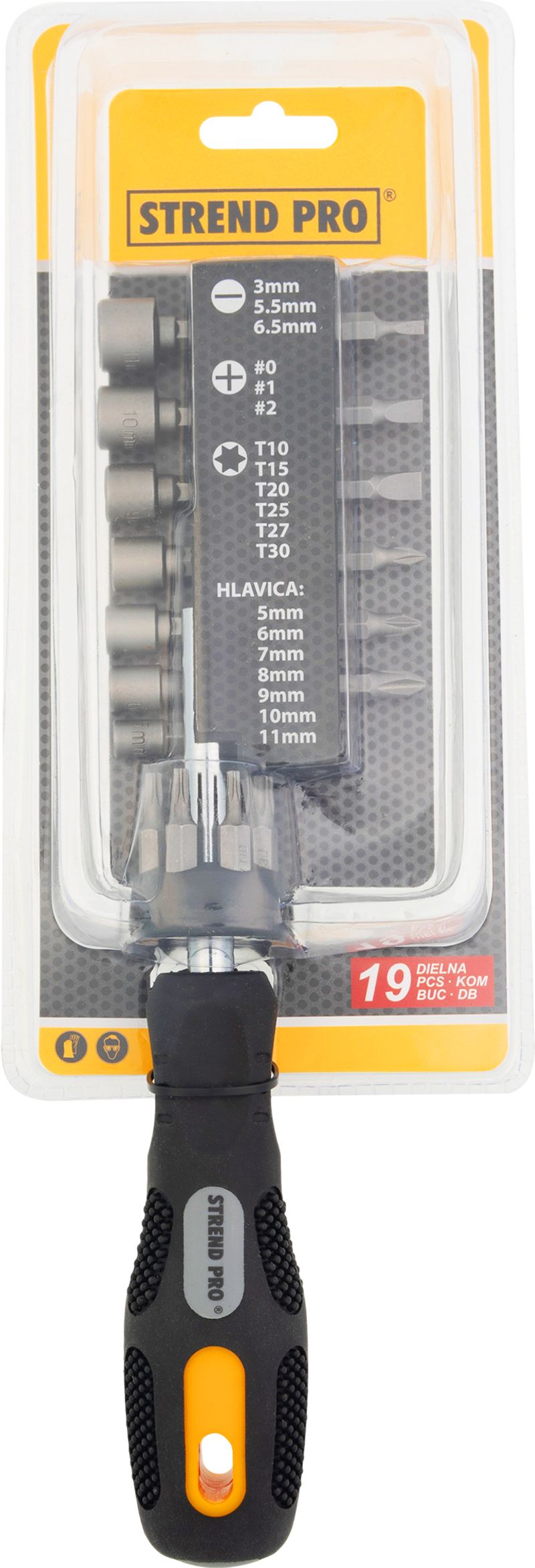 Bit és dugókulcs készlet Strend Pro SD0539, 19 részes, racsnis csavarhúzóval