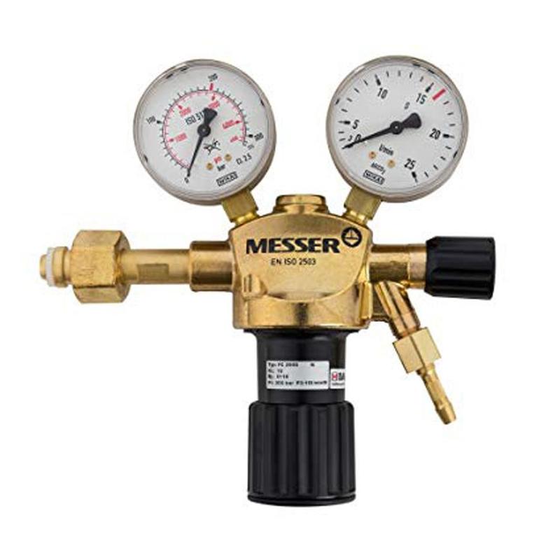 Single-stage CO 2 pressure reducer . Inlet 200 bar. Series Messer Constant 2000. Flow rate measured on output pressure gauge in liters.