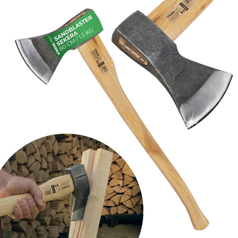 Strend Pro favágó fejsze lakkozott fa nyéllel. A fejszefej homokozott és festett.