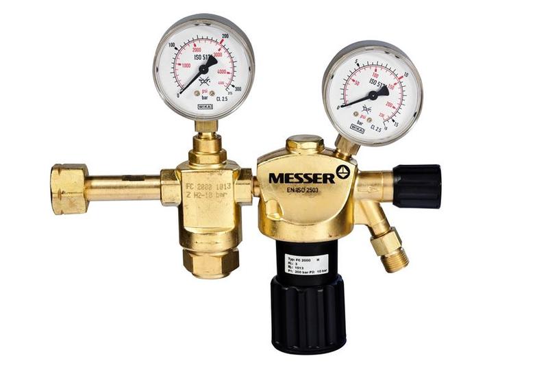 Two-stage flammable gas pressure reducing valve . Suitable for methane, hydrogen and forming gases. Inlet 200 bar. Messer Constant 2000 series. Allows more accurate adjustment and maintenance of outlet pressure. Detailed raster scale on output manometer.