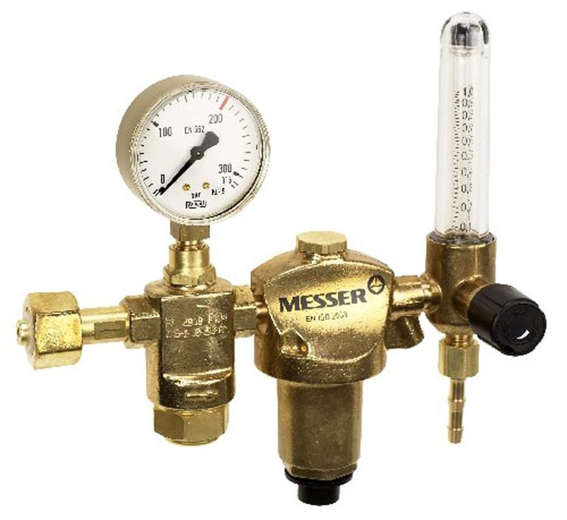 Two-stage pressure reducer for Argon / CO 2 . Inlet 200 bar. Series Messer Constant 2000. Measurement of output flow by float manometer. This pressure regulator maintains the set gas outlet flow rate , regardless of the height and frequency of the offtake and the amount of gas in the bottle throughout the welding time.