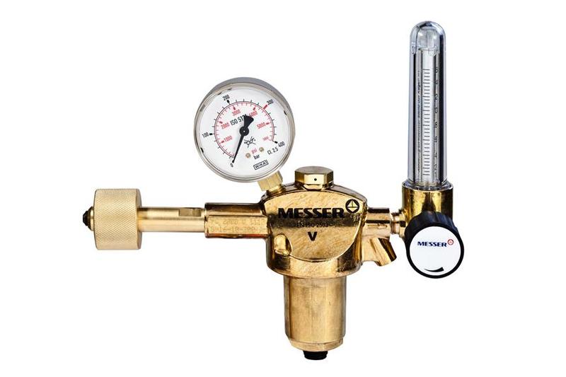Single-stage pressure reducing valve for Argon / CO2 . Inlet 300 bar. Series Messer Constant 2000. Flow rate measured on output pressure gauge in liters, through float flowmeter.