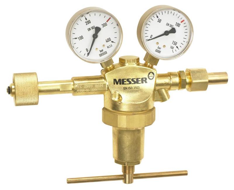 Single stage nitrogen / shielding gas pressure reducer . Suitable for nitrogen, argon, inert gases, CO2 (Kohlendioxide), mixed gas. Inlet 300 bar. Series Messer Constant 2000.