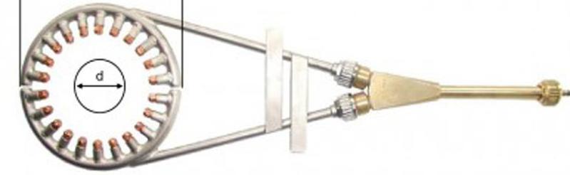 Circular burner from seamlessly drawn, chemically nickel-plated steel tube, with replaceable FK-A type 0, 1, 2, or 3 nozzles from copper and flame exit (F). Double mixer feed and additional distribution tube. Mixing tube made of heat-resistant, stainless steel. Excellent for technical heating.