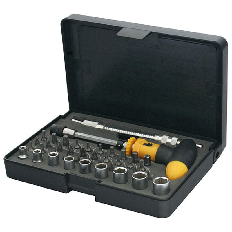1x racsni T fogantyúval 100 mm-es fej adapterrel 1x 175 mm rugalmas hosszabbítás 9x fej 5-13 mm; 31x bit 25 mm 5x SL 3, 4, 5, 6, 7 6x PH 1, 2, 3 ... teljes leírás