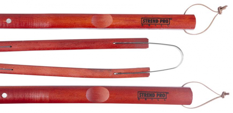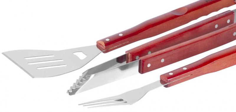 A grillkészlet három szerszámot tartalmaz - grilltut, forgatót és grillfogót. A készlet rozsdamentes acélból készült, használat után könnyen mosható. Nyele fából készült. Praktikus akasztóhurokkal rendelkeznek.