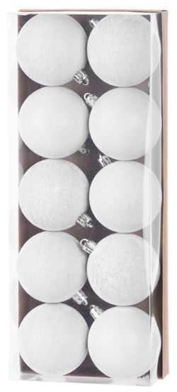 Karácsonyfadísz készlet ünnepi díszítéshez szolgál. 10 db, 5 cm átmérőjű karácsonygömbből áll. A gömbök színe ezüst. Műanyagból készültek.