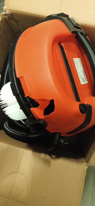 POPIS ZÁVADY: Poškodený vrch vysavača, rozbalený.