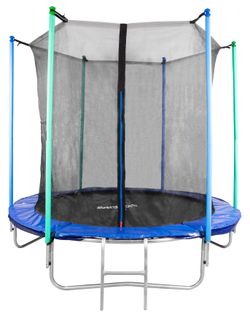 Nagyon jól fog szórakozni a Skipjump trambulinnal! A trambulin kizárólag háztartási használatra készült. Egyaránt alkalmas gyermekek és felnottek számára. A trambulin maximális terhelhetosége 150 kg. A túlterhelés azonban károsíthatja a trambulint! Professzionális eszköznek nem alkalmas. A trambulin kiváló minoségu polipropilén ugrófelülettel és masszív, stabil szerkezettel rendelkezik, amely deformációnak ellenálló, edzett acélból készült. A trambulin keretén - a rudakon és a rugókon - habvédot alkalmaznak. A külso háló megakadályozza a kiesést. Elonye a létra, amely könnyu hozzáférést tesz lehetové a trambulinhoz.