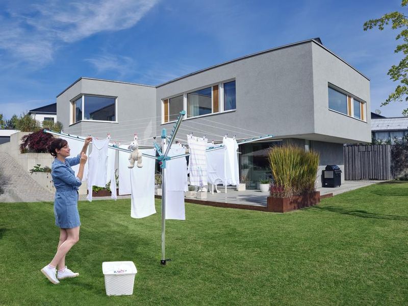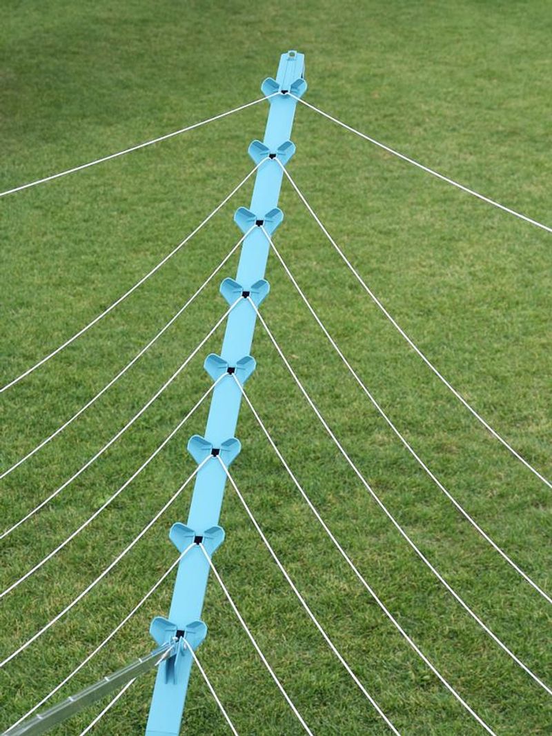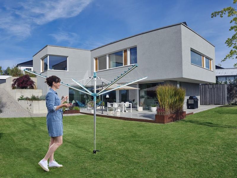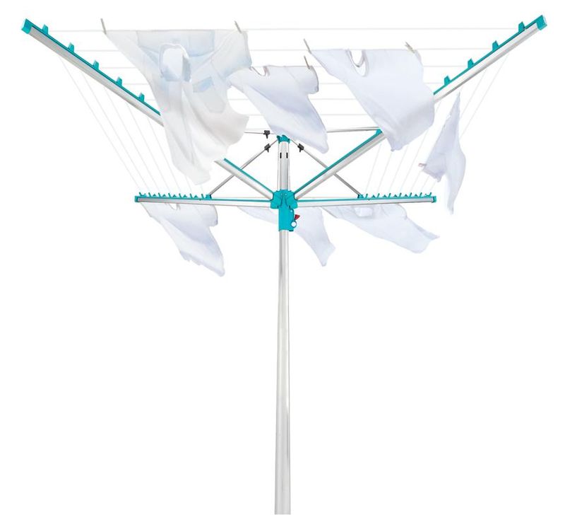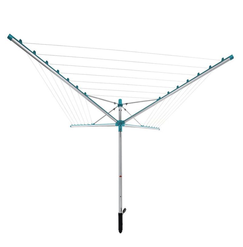 Kültéri forgó szárító, időjárásálló, rozsdamentes alumíniumkeret, szabadalmaztatott zsinórbehúzó rendszer az oldalfalakban. A zsinórok védve vannak az esőtől és a szennyeződésektől, ideális zsinórkioldó mechanizmus, a szárító karok végére akasztási lehetőség. 50 m zsinór = 5 adag szennyes. A csomagban található egy tartó a betonozáshoz.