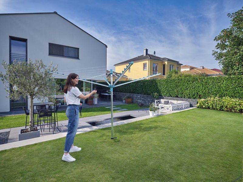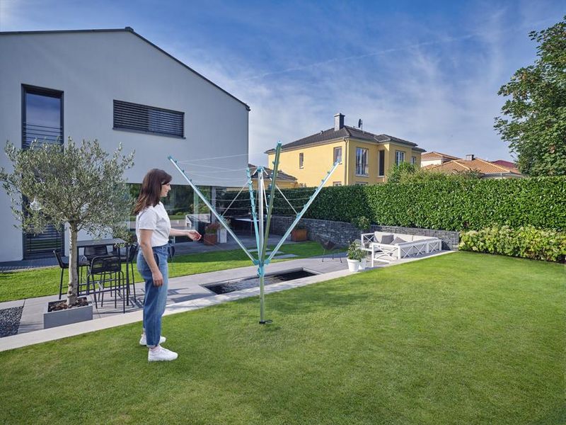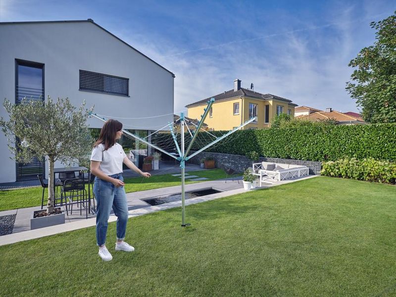 Kültéri forgó szárító, időjárásálló, rozsdamentes alumíniumkeret, szabadalmaztatott behúzható oldalsó zsinórrendszer. A zsinórok védve vannak az esőtől és a szennyeződésektől, ideális zsinórkioldó mechanizmus, a szárító karok végére akasztási lehetőség. 40 m zsinór = 4 adag szennyes. A csomagban található egy konzol a betonozáshoz.