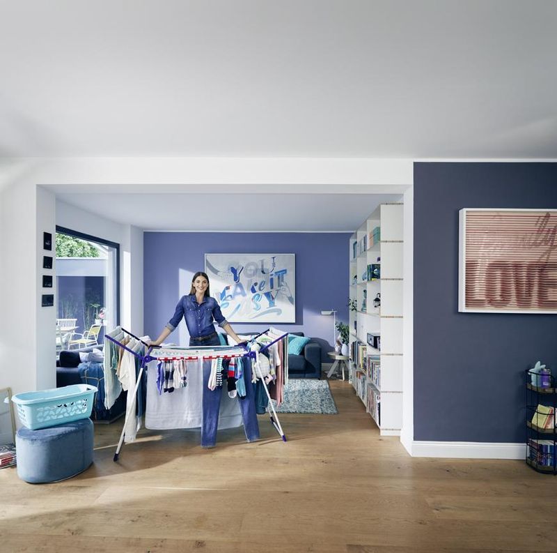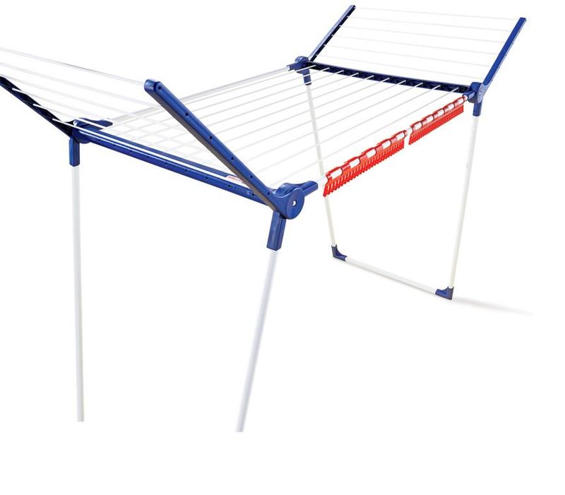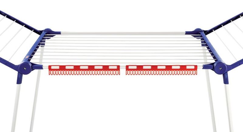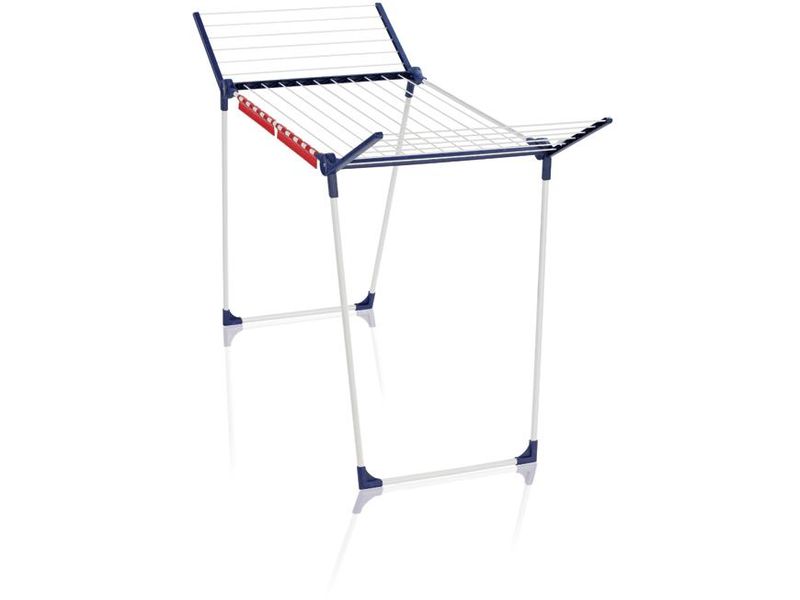 Stabil ruhaszárító csuklós oldalakkal, ideális beltéri és kültéri használatra, 18 m szárítási terület = akár 2 mosógépnyi szennyes, a csuklós oldalak magassága 105 cm, hosszú ruhadarabok felakasztásának lehetősége, 2 easyclip-et tartalmaz a kisebb méretű szennyes szárításához, 5 év garancia.
