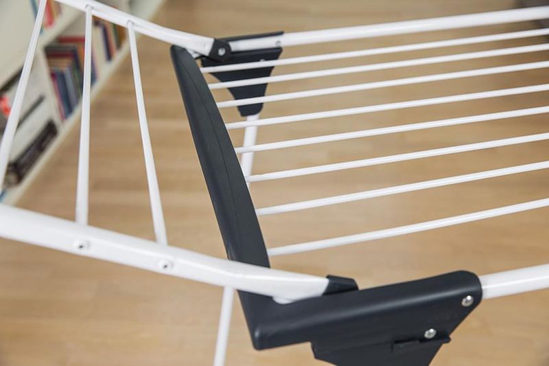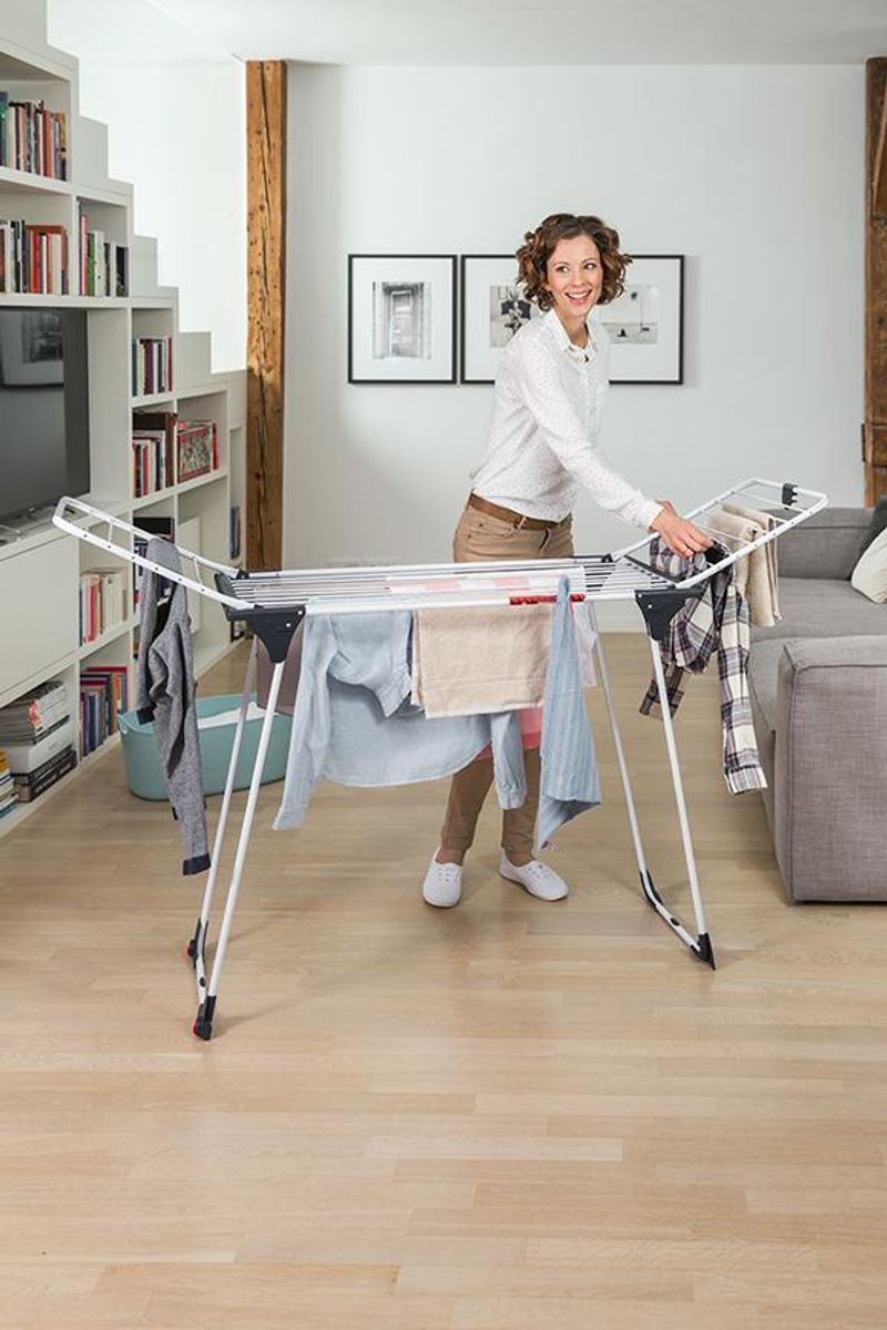 A Vileda King szárító biztonságos és stabil kialakítású, alumínium és vas kombinációjából készült. Ez a szárnyas szárítógép 20 méteres maximális szárítási felületével nélkülözhetetlen segítője a mindennapi mosási rutinjának. Használja ki előnyeit, és tapasztalja meg a tökéletes ruhaszárítás élményét. AXXL méretű huzaloknakköszönhetően a Vileda King szárító segít abban, hogy a szárítás során kevesebb gyűrődést érjen el ruháin, ami viszont csökkenti a vasalási időt. A hely és a mobilitás a két legfontosabb tulajdonság, ha szárítókról és a ruhaszárításról van szó.