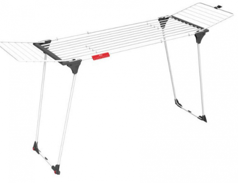 Az ágyneműk és terítők szárítására is ideális a középső, kitekerhető huzaloknak és az akár 1 méteres magasságnak köszönhetően. A központi huzalok 118 és 189 cm között feszíthetők ki.