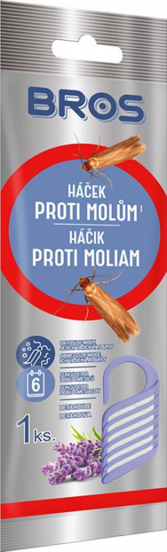 A Bros moly elleni kampó hatékonyan védi a ruhákat a szekrényekben, fiókokban és szekrényekben a molykárosodástól. Akár 6 hónapig is véd a szekrénymolyok ellen a fejlődés minden szakaszában, elpusztítva a petéket, lárvákat és kifejlett egyedeket. Friss és kellemes levendula illatot kölcsönöz a ruhadaraboknak.