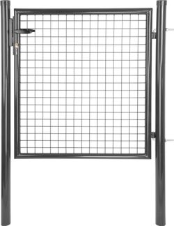 Egyszárnyú kerti kapu hegesztett hálós béléssel, 50 x 50 mm-es szembőséggel és 4 mm vastagságú huzallal. A kivitel cink + PVC. Színe zöld. A termék magassága = a kapu magassága a földtől a szárny tetejéig.