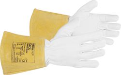 Teljes bőr hegesztőkesztyű Strend Pro Industrial Decio.A tenyér és a hátoldal fehér kecskebőrből készült.A mandzsetta elasztikus pánttalmarhabőrből készült hasított. Megfelelnek az EN ISO 21420:2020 szabványnak (II. kategória).