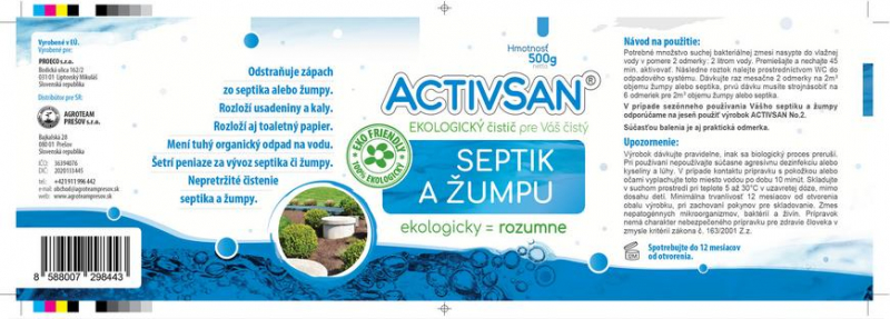 Activsan Septik a žumpa 500g je prípravok určený pre rozklad organických nečistôt, usadenín a kalov v žumpách a septikoch. Pôsobením baktérií a nimi tvorených enzýmov dochádza ku skvapalneniu pevného organického odpadu, ktorý sa zmení v nezapáchajúcu kvapalinu. Kvapalinu možno neskôr bez problémov čerpať, nedochádza k upchávaniu kanalizácie ani prípadných trativodov. Pravidelným používaním tak odpadá časté a nákladné vyváženie a čistenie septiku alebo žumpy, pretože predtým sa tvoriace kaly a usadeniny znižovali využiteľný obsah žumpy alebo septiku a vývoz teda musel byť oveľa častejší. Všetok organický odpad sa rozkladá najmä na vodu a CO2.