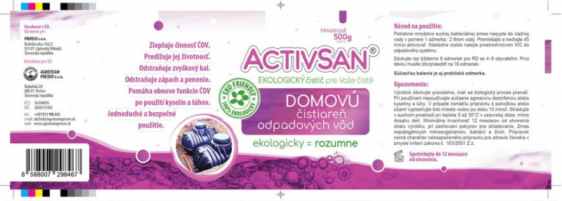 Activsan ČOV 500g je prípravok určený k rozkladu zvyškových organických nečistôt v domovej čistiarni odpadových vôd. Optimalizuje chod domovej čističky odpadových vôd tým, že odstraňuje zvyškový kal a usadeniny, a tak zaisťuje bezporuchový chod čistiarne odpadových vôd, predchádza upchávaniu potrubia a zamedzuje tvorbe nepríjemného zápachu. Po jeho použití dochádza k rozkladu organických zvyškov v domovej čističke odpadových vôd na tekutinu bez zápachu. Výrobok je dôležitý tam, kde má domáca čistička odpadových vôd preplnenú kapacitu prísunu odpadových vôd z domu.