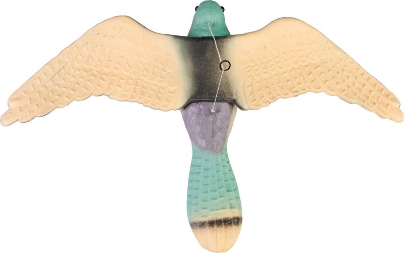 - Kialakítás: A sólyom, egy természetes madárragadozó valósághű megjelenése hatékonyan tartja vissza a galambokat, a sztariszkókat és más madarakat a leszállástól és a termés károsításától.