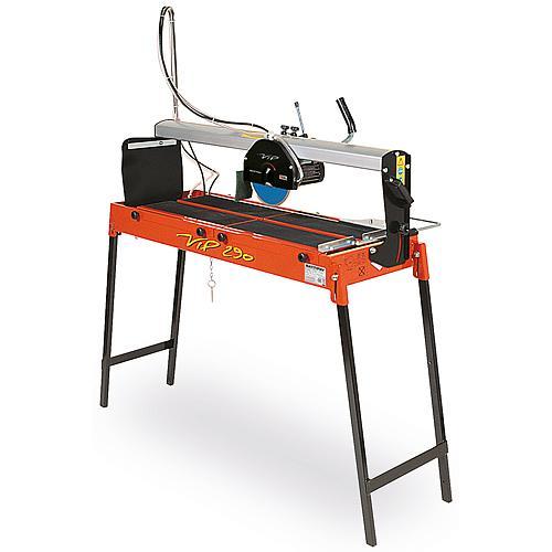 Fűrész kerámia és gres csempe egyenes és "vidám" (45 ° –os) szélezésére <br> Felszerelés: b> <br>– egyfázisú motor 230V ~ 50 Hz 1 kW– csúszó vágófejek és billenő motor– kapcsoló kioldó kerékkel– S1 vízszivattyú– 200 mm átmérőjű gyémántlemez– maximális vágási hossza 95 cm–ig.– maximális vágási vastagság: 4 cm.– vízhűtés